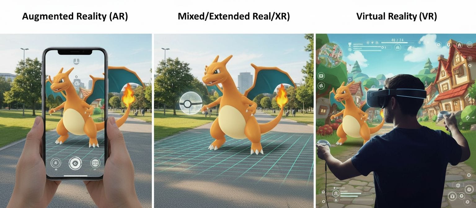 Virtual Reality (VR) - Vollständige Immersion in virtuelle Welt - Nutzer sieht nur digitale Inhalte - Ideal für Training, Collaboration, Präsentationen ohne Ablenkung - Benötigt geschlossene VR-Brille
