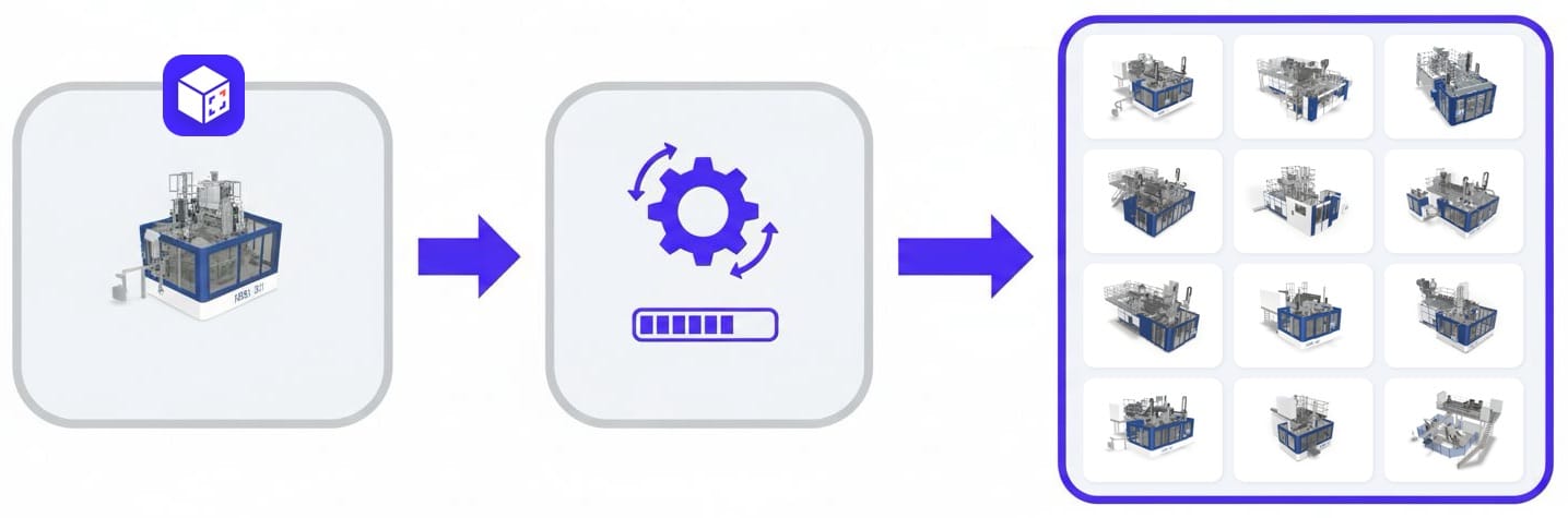 Sie launchen eine neue Produktlinie: 50 Maschinen-Varianten, jeweils aus drei Perspektiven, in konsistenter Qualität. Deadline: vier Wochen.