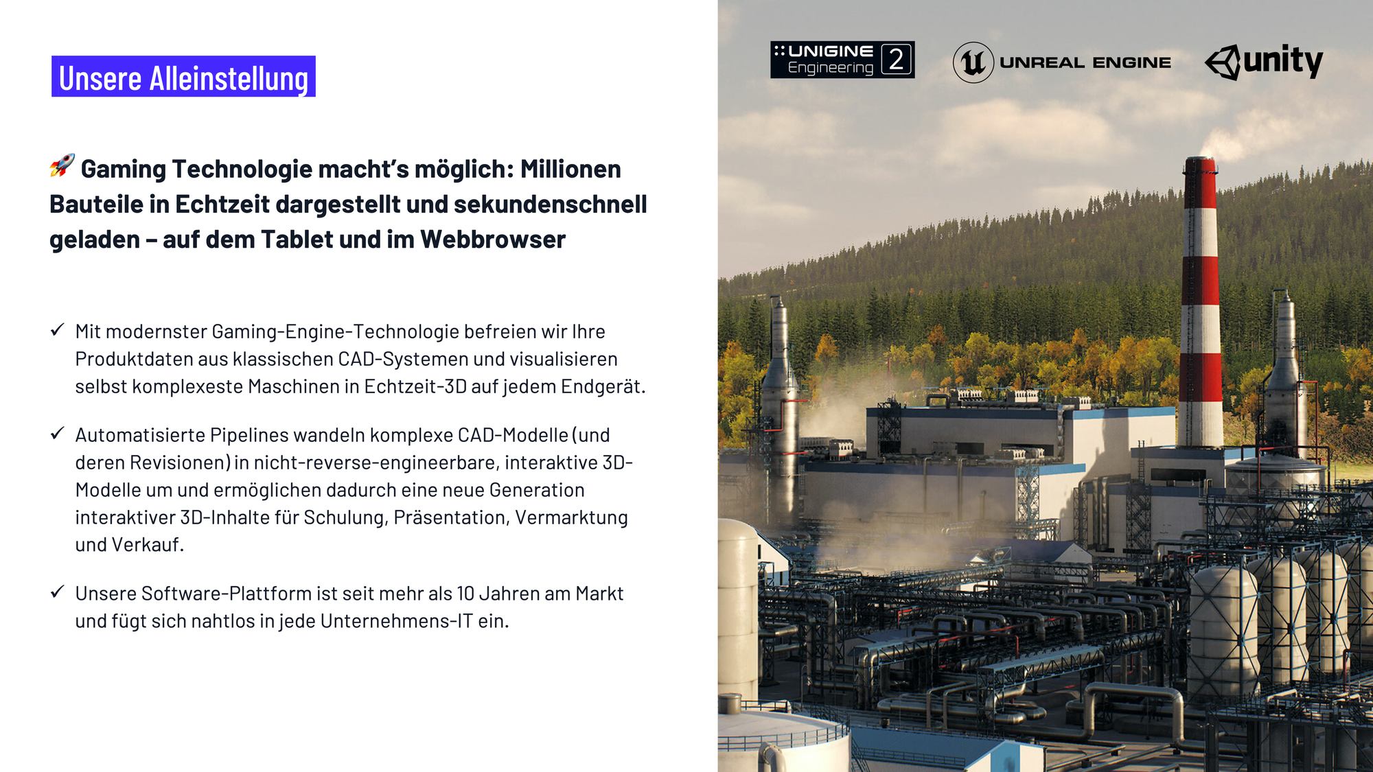 Innovativen Visualisierungslösungen machen technische Komplexität sofort verständlich und ermöglichen es unseren Kunden, sich im globalen Wettbewerb durch eindrucksvolle Produktkommunikation von der Masse abzuheben.